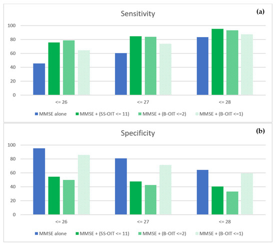 Sensitivity (a) and specificity (b) values for different combinations of the MMSE, the SS-OIT, and the B-OIT using diverse cutoff scores in the scenario depicted in Figure 1.