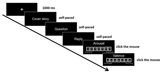 Participants sat in a comfortable chair in a sound-attenuating shielded room and were instructed to read each scenario carefully for comprehension. The scenarios were presented visually in the center of the computer screen. The procedure of the behavioral test is shown in Figure 1. Each trial started with a fixation cross (+) in the center of the screen for 1000 ms. Then, the cover story appeared in the screen. Participants were asked to press the space bar when they finished reading the cover story. After that, the question asked by You (we asked participants to imagine You as themselves) was presented in the center of the screen till participants pressed the space bar and the replies were presented in the center of the screen. After they read the replies and pressed the space bar, the participants were asked to rate their own emotional arousal (1 to 7, 1 representing the least arousal and 7 representing the most arousal) and valence (−3 to 3, −3 representing the most negative and 3 representing the most positive) brought by the replies in each scenario by clicking the mouse. Participants were required to involve themselves as much as possible into the scenarios and to rate their emotional experience as if they had received such replies.