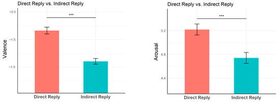 Valence rating scores (−3~3, left panel) and arousal rating scores (1~7, right panel) for target sentences in each condition (indirect reply and direct reply). Error bars represent the standard error. *** represents p < 0.001.