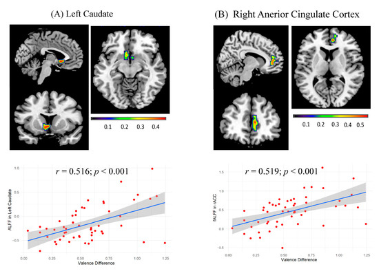 In the present study, the left caudate showed a positive relationship with the valence difference only in the ALFF analysis and the right ACC only in fALFF analysis. This might be related to the fact that ALFF and fALFF are different measures of spontaneous brain activity which represent two levels of significance, and their retest reliability is also different [41]. In previous rfMRI studies, ALFF and fALFF were frequently found showing different results in the same set of data [32,54,55]. Given that ALFF and fALFF are different rfMRI measures, it is reasonable that different results were found for the two measures.