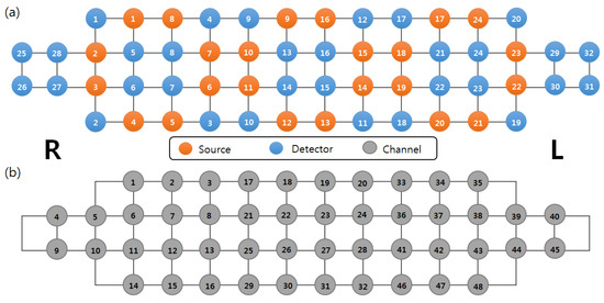 The hemodynamic response of the prefrontal cortex was recorded using a high-density NIRS device (NIRSIT; OBELAB Inc.), which was composed of 24 sources (laser diodes) emitting two wavelengths (780/850 nm) and 32 photodetectors at a sampling rate of 8.138 Hz. The channel separation between the source and the detector was 3, and the total number of channels was 48; the source-detector array is shown in Figure 1a,b. The detected light signals were filtered by a bandpass filter. The cutoff frequency of the low pass filter is 0.1 Hz to minimize physiological noise such as heart-rate and Mayer wave and 0.005 Hz for the high pass filter. During the resting period, low-quality channels with a signal-to-noise ratio of less than 30 dB were rejected prior to hemodynamic data extraction to prevent misinterpretation.