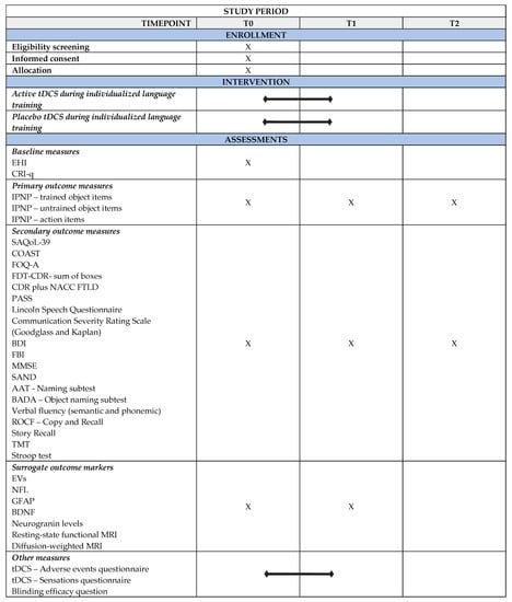 SPIRIT figure for the enrollment, intervention, and assessment schedule in the study. AAT = Aachener Aphasia Test; BADA = Battery for the Assessment of Aphasic Disorders; BDI = Beck Depression Inventory; BDNF = Brain-derived neurotrophic factor; CDR plus NACC FTLD = Global Clinical Dementia Rating plus National Alzheimer’s Coordinating Center Frontotemporal Lobar Degeneration; COAST = Communication Outcome After Stroke; CRI-q = Cognitive Reserve Index-questionnaire; EHI = Edinburgh Handedness Inventory; EVs = Extracellular vesicles; FBI = Frontal Behavioral Inventory; FTD—CDR = Frontotemporal Dementia—Clinical Dementia Rating Scale; FOQ—A = Functional Outcome Questionnaire-aphasia; GFAP = Glial Fibrillary Acidic Protein; IPNP = International Picture Naming Project Task; MMSE = Mini Mental State Examination; MRI = Magnetic Resonance Imaging; NFL = Neurofilament light chain; PASS = Progressive Aphasia Severity Scale; ROCF = Rey—Osterrieth Complex Figure; SAND = Screening for Aphasia in NeuroDegeneration; SAQoL—39 = Stroke and Aphasia Quality of Life Scale—39; tDCS = transcranial Direct Current Stimulation; T0 = Baseline Assessment; T1 = Post-treatment Assessment; T2 = Follow-up Assessment; TMT = Trail Making Test.
