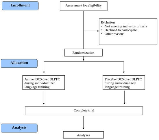 After recruitment, the subjects will be randomized into one of two parallel groups: (i) active tDCS over the DLPFC combined with an individualized language training group or (ii) placebo DLPFC-tDCS with an individualized language training group. The two groups will be matched for age, education, and language deficit severity. All participants will undergo a clinical, cognitive, and language evaluation at the baseline (T0), post-treatment (T1), and at the 3-month (T2) follow-up. Magnetic Resonance Imaging (MRI) and biomolecular data will be collected at T0 and T1 (after the treatment). The trial work plan is shown in Figure 2.