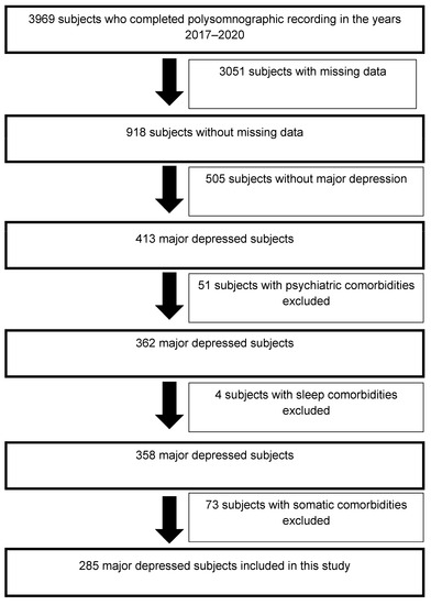 The data of 285 major depressed subjects who carried out a polysomnographic recording between 1 January 2017 and 31 December 2020 were collected from the database of the Erasme Hospital Sleep Laboratory (Figure 1). Table 1 presents the inclusion and exclusion criteria applied for the recruitment of these major depressed subjects. In addition, in this study, we only recruited major depressed subjects since the objective was to focus on this particular subpopulation where anhedonia complaints seem to play a central role in the occurrence of suicidal ideations [13,14,15,19]. Finally, Annex S1 (Supplementary Data) describes the outpatient recruitment procedure for the major depressed subjects included in this study.