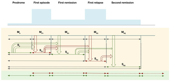 The SAMP evolves in stages, from prodrome to subsequent psychotic episodes and their remissions. At each stage, memories of foreground experiences (memory M) are encoded and integrated with existing background memory contexts (schema S). Figure 1 illustrates the evolution of these processes with an example from the prodrome to the first and second psychotic episodes.