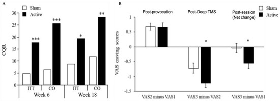 Adapted from [17]: (A) Four-week continuous quit rate (CQR) until week 6 and week 18 in patients receiving active or sham TMS. Only participants who were abstinent at week 6 were followed up to week 18. The analysis is presented in the full intent-to-treat (IIT) sample as well as the per-protocol group (which includes the individuals in the IIT sample who finished all TMS sessions). The per-protocol group is listed here as completers (CO). * p < 0.05, ** p < 0.01, *** p < 0.001. (B) Acute changes in Visual Analogue Scale (VAS) craving scores following provocation and following Deep TMS in patients receiving active or sham treatment (first session). Overall changes in craving during the first session indicate that craving in the sham group returns to baseline, whereas it is reduced compared with baseline in the active group (p = 0.026). * p < 0.05.