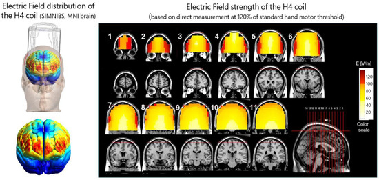 Figure 2 displays the electric field distribution maps for the H4 coil. Fiocchi et al. quantified the electric field distribution and depth induced using an H4 coil and a Figure-8 coil [44]. The H4 coil induced the highest electric fields in the PFC, insula, and ACC. Moreover, it can induce amplitude (E) in the deepest tissues, ranging between 20% and 40% of the cortical peak, and it can penetrate the cortex up to 4 cm with E > 50% of the cortical peak.