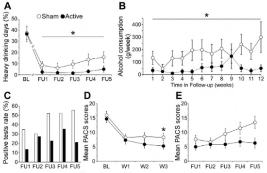 Adapted from [63]. Alcohol consumption and craving. Follow-up times: FU1, 1 week; FU2, 2 weeks; FU3, 4 weeks; FU4, 8 weeks; and FU5, 12 weeks: (A) Percentage of heavy drinking days during the follow-up phase showed significant main effects of group (p = 0.037, mean difference 7.7%, Cohen’s d = 0.5). (B) Alcohol consumption during the follow-up phase showed a significant main effect of groups (p = 0.02, mean difference = 121.78 g, Cohen’s d = 0.47). (C) Percentages of positive urine ethyl glucuronide samples during the follow-up visits indicated a trend-level effect of groups (p = 0.069). (D) During the acute phase of treatment, the Penn Alcohol Craving Scale (PACS) scores showed a significant group–time interaction (p = 0.04). Craving levels of the active group were lower than those of the sham group by W2 at the trend level (p = 0.06) and significantly lower at W3 by the end of the acute treatment phase (p = 0.01; mean difference = 3, Cohen’s d = 0.48). (E) During the follow-up phase, PACS scores showed a trend-level main effect of groups (p = 0.07, mean difference = 3.7, Cohen’s d = 0.52). Data are presented as mean ± SEM in panels. * p < 0.05. BL, baseline.