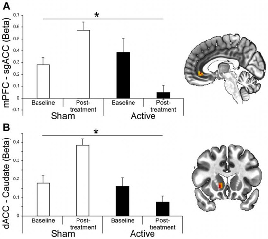 Adapted from [63]. Brain imaging results: Seed-based resting state functional connectivity findings at baseline and post-treatment. Significant group–time interaction for (A) mPFC–sgACC connectivity (p < 0.001) and (B) dACC–caudate connectivity were observed (p < 0.001). Significant main effects of groups for mPFC–dACC connectivity (p < 0.05) and dACC–caudate connectivity (p < 0.001). Data are presented as means ± SEM, * p < 0.05 between the active and sham groups.