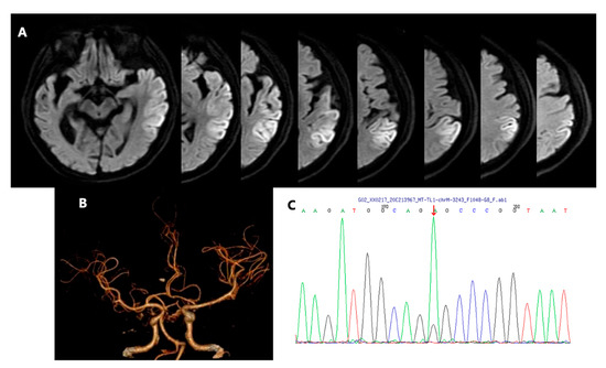 Brain diffusion-weighted image (DWI) of left temporoparietal lobe infarction lesion (A). Computed tomography angiography (CTA) showed no obvious evidence of large arterial stenosis and/or occlusion (B). Subsequent genetic testing results confirmed the chrM-3243 A>G mutation. The red arrow indicates the position of mutation (C).