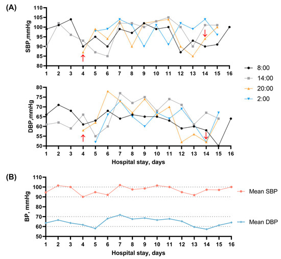 (A) Changes in blood pressure levels after admission. Red arrow: start and end of continuous use of vasopressor drugs and fluid infusion therapy; (B) Mean blood pressure measurements taken at different time points each day during the hospitalization.