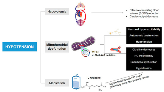 To the best of our knowledge, hypotension attributed to a component of autonomic dysfunction in MELAS patients was first reported by Zelnik et al. [15]. Subsequently, hypotension was occasionally reported, with these case studies providing more specific underlying causes for hypotension (for example, hypothyroidism [32] and sepsis [33]), and the blood pressure abnormalities or variations were not discussed in-depth. On the contrary, adult MELAS patients have been reported with elevated rates of hypertension [34]. Compared with other types of mitochondrial encephalopathy, the prevalence of hypertension in MELAS patients with m.3243 A>G mutation is remarkably higher [35]. The increased risk of hypertension is believed to be on account of mitochondrial angiopathy. In MELAS syndrome, reduced plasma concentrations of citrulline consequently can influence the synthesis of L-arginine via the urea cycle, which acts as a nitric oxide (NO) precursor, and its deficiency further lead to endothelial damage [36]. In addition, excess cytochrome c oxidase (COX) activity accompanied by mitochondrial proliferation in endothelial and smooth muscle cells can result in increased NO binding of NO and a relative lack of its availability [37]. The insufficiency of NO exerting a vasomotor regulatory effect subsequently increases the risk of hypertension. While in our case, episodes of hypotension were detected in the patient during all three hospitalizations, and there was no significant improvement observed with treatment. As illustrated in Figure 2, the patient’s episodes of hypotension during the second hospitalization were most pronounced around the 5th and 14th days. We propose possible mechanisms to explain the puzzling refractory hypotension of our patient as follows and provide a comprehensive summary in Figure 3.