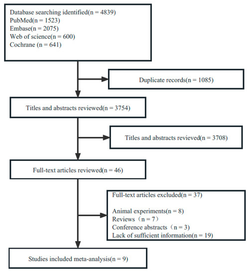 A total of 4839 publications were retrieved up to 6 March 2023. After removing duplicates, 3754 publications were retained for the title and abstract screening. Full texts from 46 publications were reviewed according to the inclusion and exclusion criteria. Nine studies reporting animal experiments and seven reviews were excluded. We also excluded 3 conference abstracts and 19 articles containing insufficient information. Consequently, nine original studies were included. The flowchart of the study selection is shown in Figure 1.