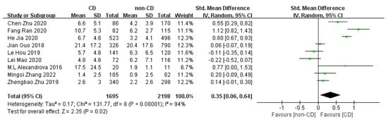 Nine studies comparing peripheral CRP concentrations between CD and non-CD patients (1695 CD patients and 2198 non-CD patients) were used for the meta-analyses. The pooled SMD estimated via random effect models showed a significant increase in CRP levels in CD patients versus non-CD patients (SMD = 0.35, 95% CI = (0.06; 0.64); p = 0.020), with high heterogeneity (I2 = 94%, p < 0.001) (Figure 2).