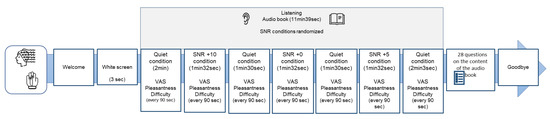 Graphical representation of the experimental protocol employed in the present pilot study. The auditory conditions during the audiobook listening were pseudorandomized among participants, maintaining the sequence Quiet–signal-to-noise ratio (SNR)–Quiet–SNR–Quiet–SNR–Quiet, resulting in 7 conditions, and for correspondence of each of them, 4 questions have been made at the end of the listening phase in order to assess comprehension. Every 90 s, a visual analog scale (VAS) concerning perceived pleasantness and a VAS concerning perceived difficulty were presented to the participant.
