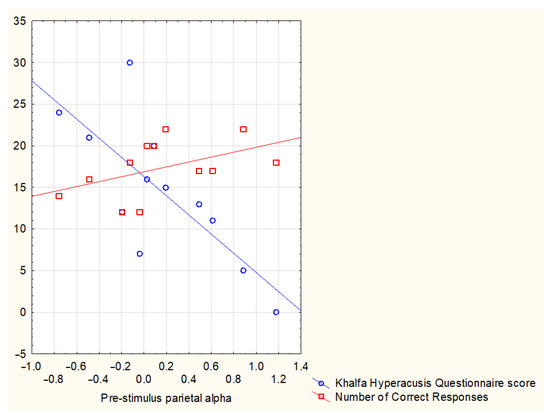 Scatterplot representing the correlation between pre-stimulus parietal alpha levels and, respectively, the number of correct responses for the entire task irrespective of the specific auditory condition (Quiet, SNR10, SNR5, SNR0) and the score reported in the hyperacusis questionnaire by Khalfa and colleagues [52].