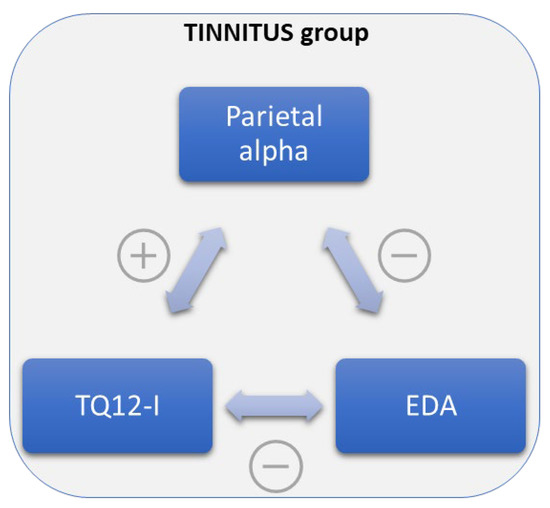 Furthermore, parietal alpha levels during listening to the auditory stimuli, positively correlated to the TQ12-I (Figure 4), appear to reflect a higher listening effort in tinnitus patients and higher distress related to tinnitus symptoms perception.