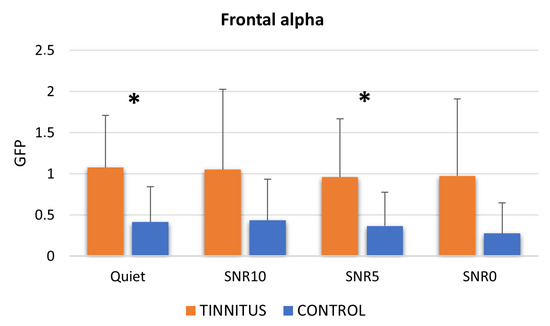 Graph representing the mean frontal alpha values estimated for each group in each condition and the statistically significant differences resulting from the Mann–Whitney U-test between TIN and CTRL groups (Quiet, SNR10, SNR5, SNR0). * stands for p < 0.05. Error bars stand for standard errors.