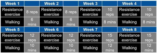 For the moderate intensity walking intervention at a brisk pace, first the heart rate reserve (HRR) was calculated using the maximum and resting heart rates. The maximum walking speed was acquired from the 6 min walking test (6MWT) where we measured their heart rate right after the 6MWT. At weeks 1 and 2, participants started at their 60% HRR and then increased to 65%, 70% to 75% of their HRR every two weeks. The total duration for one session of resistance exercise or walking was 6–15 min as shown by an example in Figure 1. We recommended that the participants walk indoors in their dining room or other places with ample space and sufficient light. This was to avoid carpets which can cause them to fall. If the distance in the dining room was too short, we suggested walking between rooms. The duration of the daily exercise containing two sessions (morning and evening) was 152–256 min. In addition to resistance exercise, the weekly walking exercise was 120–180 min. One-time walking or resistance training was considered as one session and the total number of sessions was 96 (2 times per day, 6 days a week, for 8 weeks). Figure 1 presents an example of the moderate intensity exercise intervention programme from the doctoral thesis of the first author, Fei Zhao [92].