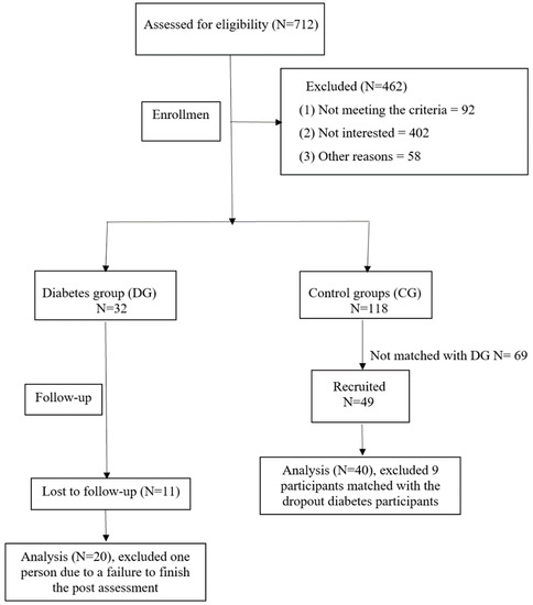Once the research received approval from the IRB, recruitment flyers were sent out to various locations including senior centers, churches, independent living facilities, assisted living facilities, and the University at Buffalo Clinical and Translational Science Institute (Figure 1 shows the CONSORT flow diagram). The institute provided a list of individuals who met the major inclusion criteria. Interested individuals reached out to the investigator directly, while those who did not make contact received either a phone call or a mailed flyer as a follow-up. For the intervention group, a consecutive sampling method was employed. As for the control group, participants were selected from convenience samples, ensuring age and sex matching. The first author, Fei Zhao, led the recruitment under the guidance of Machiko Tomita and Paresh Dandona who is the faculty expert on diabetes.