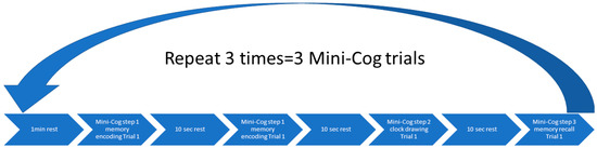 The Mini-Cog and Trail Making test [98] examined cognition while the physical performance was measured using the 6MWT and the BHR task. The Mini-Cog instrument assesses short-term memory and visuo-constructive abilities. There are three steps [110], see Figure 4, where the first step is to measure the ability to repeat three words immediately after the experimenter. The second step is to draw a clock based on the verbally assigned time in 3 min. The last step is to recall the three words from the first step. A systematic review has revealed that the Mini-Cog test has an excellent sensitivity of 0.91 and an excellent specificity of 0.86 to detect dementia [111].
