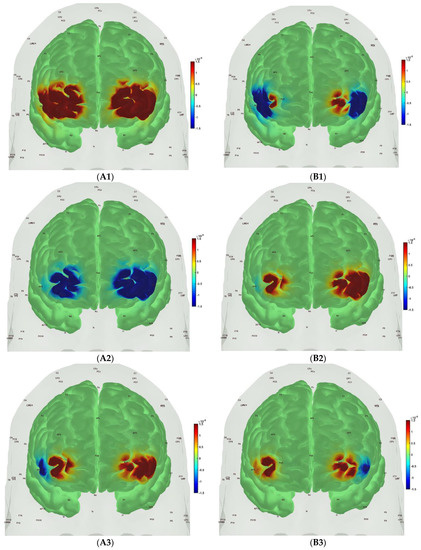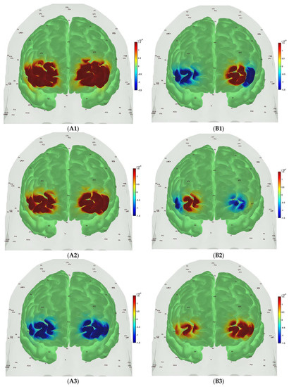 Figure 6, Figure 7, Figure 8 and Figure 9 show the prefrontal activation (oxyHb in A and deoxyHb in B) from the AtlasViewer software based on the HRFs from the HOMER3 software computed during the Mini-Cog tasks (Mini-Cog step 1 in A1, B1; Mini-Cog step 2 in A2, B2; Mini-Cog step 3 in A3, B3). All the HRFs from the HOMER3 software are presented in the Supplementary Materials (Figure S1). Figure 6 shows the results from sedentary healthy Control group that showed bilateral superior frontal gyrus, dorsolateral, oxyHb, and deoxyHb activation during memory encoding and clock drawing tasks but only left Superior frontal gyrus, dorsolateral, and oxyHb activation and right Superior frontal gyrus, dorsolateral, oxyHb inactivation during the memory recall task. Then, Figure 7 shows the results from active healthy Control group that showed bilateral superior frontal gyrus, dorsolateral, and deoxyHb activation during the memory encoding task and oxyHb activation during clock drawing tasks and bilateral superior frontal gyrus, dorsolateral, and deoxyHb activation and oxyHb inactivation during the memory recall task. Here, oxyHb and deoxyHb activation may become positively correlated in the presence of systemic confounds and negative correlation between oxyHb and deoxyHb signals can be a characteristic of NVC [115]—see our HRFs in the Supplementary Materials (Figure S1). Notably, the superior frontal gyrus, dorsolateral, showed activation that is postulated to contribute to higher cognitive functions and particularly to working memory [116]. In prior works, Jahani et al. [89] showed the activation of the dorsolateral prefrontal cortex during memory encoding and recalling.