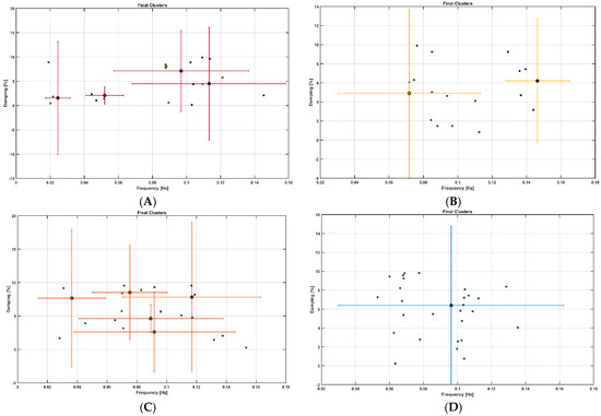 In this study, we introduced OMA of the task stimulus-evoked hemodynamic responses (oxyHb, deoxyHb) pre-processed in the NIRS Brain AnalyzIR Toolbox [104]. The low pass filter was set at the cut-off frequency of 0.2 Hz to capture the LFO (0.05–0.2 Hz) where the cognitive load excitation of the prefrontal cortex was considered as realizations of white noise processes. OMA is for the extraction of modal parameters (natural frequency, damping) where we used a covariance-driven Stochastic Subspace Identification (SSI-Cov) approach that also provided modal parameter uncertainty estimates (details are in the Supplementary Materials). Here, the principal component analysis provided the projection space for the modal solution [106]. We also used frequency domain decomposition [107] to compare with the SSI-Cov results from time domain decomposition. In our prior computational work on experimental modal analysis (EMA) using multi-modal signals including electroencephalogram [18], we have estimated modal parameters by simple peak picking and found modulation by external excitation with transcranial electrical stimulation (tES). The stabilization diagram for modal analysis (‘modalsd’ in Matlab) allowed selection of stable modes (frequency, damping) that do not change substantially with the change in the size of the model (i.e., estimated number of modes). From our prior computational work on EMA of NVC [18,19,103], a maximum of 30 modes were estimated in the current study using OMA. For OMA, we were interested in the physiological modes based on our prior computational work on EMA of NVC [18,19,103] with frequencies less than 0.2 Hz that were found relevant for fNIRS including LFO (0.05–0.2 Hz) and VLFO (<0.05 Hz) [16,17]. Finally, we applied a multi-stage clustering for automated OMA built on the definitions of the pole distance and modal assurance criterion [108] using the Modal Toolkit (accessed on 12 June 2023 https://code.vt.edu/vibes-lab/modal-analysis).