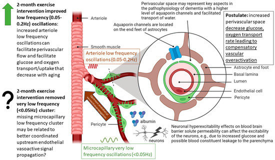 Summary of the mechanistic understanding of our OMA results. The ‘green arrow’ shows expected improvement in the LFO (0.05–0.2 Hz) due to 2-month exercise intervention; however, the ‘question mark’ shows that the effects on the VLFO (<0.05 Hz) need investigation vis-à-vis coordination of the microcapillary dilatations in VLFO with the arteriole dilatations in LFO via upstream endothelial vasoactive propagation and its communication with the vascular smooth muscle cells.