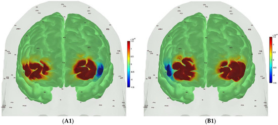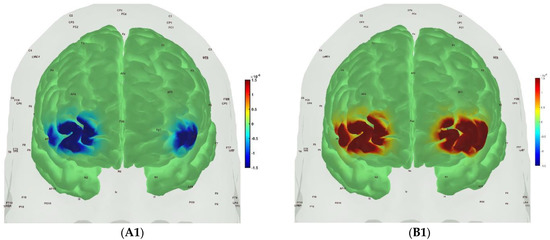 Figure 6, Figure 7, Figure 8 and Figure 9 show the prefrontal activation (oxyHb in A and deoxyHb in B) from the AtlasViewer software based on the HRFs from the HOMER3 software computed during the Mini-Cog tasks (Mini-Cog step 1 in A1, B1; Mini-Cog step 2 in A2, B2; Mini-Cog step 3 in A3, B3). All the HRFs from the HOMER3 software are presented in the Supplementary Materials (Figure S1). Figure 6 shows the results from sedentary healthy Control group that showed bilateral superior frontal gyrus, dorsolateral, oxyHb, and deoxyHb activation during memory encoding and clock drawing tasks but only left Superior frontal gyrus, dorsolateral, and oxyHb activation and right Superior frontal gyrus, dorsolateral, oxyHb inactivation during the memory recall task. Then, Figure 7 shows the results from active healthy Control group that showed bilateral superior frontal gyrus, dorsolateral, and deoxyHb activation during the memory encoding task and oxyHb activation during clock drawing tasks and bilateral superior frontal gyrus, dorsolateral, and deoxyHb activation and oxyHb inactivation during the memory recall task. Here, oxyHb and deoxyHb activation may become positively correlated in the presence of systemic confounds and negative correlation between oxyHb and deoxyHb signals can be a characteristic of NVC [115]—see our HRFs in the Supplementary Materials (Figure S1). Notably, the superior frontal gyrus, dorsolateral, showed activation that is postulated to contribute to higher cognitive functions and particularly to working memory [116]. In prior works, Jahani et al. [89] showed the activation of the dorsolateral prefrontal cortex during memory encoding and recalling.