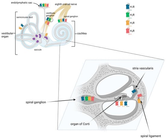 Like in spiral ganglion neurons, H1R, H2R, H3R, and H4R were detected on vestibular ganglion cells using immunohistochemistry [53,54,56]. Tritto et al. examined vestibular neurons with immunofluorescence and found that approximately 30% of the nerves stained positively for H3R [53].