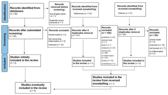 Additionally, the reference lists of selected studies and the papers that cited selected articles were screened to identify relevant articles. This method resulted in identifying a total of 190 papers. Next, two independent researchers (M.F. and M.M.-Z.) read abstracts, keywords and titles in order to establish if the paper reported an original study accounting for the associations between SB and inflammatory markers. Studies that one researcher positively qualified were left to the decision of the third investigator (K.F.). In case the abstract did not provide sufficient information to determine if the paper should be excluded, the researchers followed with reading the full text. This strategy resulted in excluding reviews, qualitative research and quantitative studies that mentioned either inflammation or SB but did not assess these constructs. Next, five full texts were assessed for eligibility and eventually included and analyzed in the systematic review.