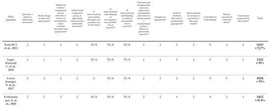 - Kmet, L.M.; Cook, L.S.; Lee, R.C. Standard Quality Assessment Criteria for Evaluating Primary Research Papers from a Variety of Fields; Alberta Heritage Foundation for Medical Research (AHFMR): Edmonton, AB, Canada, 2004. [Google Scholar]