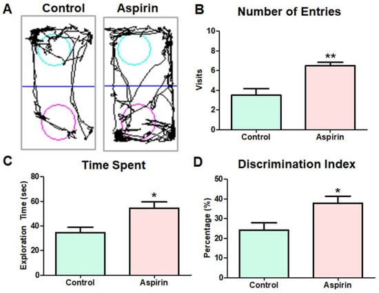 3.1. Aspirin Treatment Improved Novel Object Recognition in Experimental Mice