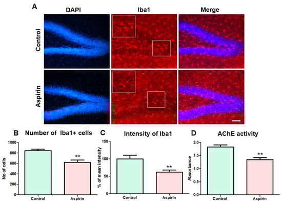 3.5. Aspirin Treatment Decreased the Abnormal Number of Microglial Cells in the Hippocampus and Reduced the Activity of AChE in the Blood of the Experimental Animals