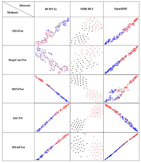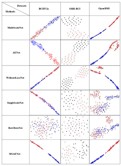 The visualization results of the comparison experiment with the subject-independent setting are shown in Figure 2. The one-dimensional vector of the last layer of the MSAENet is embedded into a two-dimensional space for visualization by the t-SNE method. Different shapes indicate that different parts of the motor imagery are performed: triangles indicate the left hand, circles indicate the feet, and crosses indicate the right hand. Different colors are used to distinguish the visualization results in order to represent them more intuitively. The MSAENet’s visualization results in better classification than other methods, with a more compact intra-class distribution and larger inter-class spacing. The visualization distribution of the MSAENet outperforms the other networks on the two datasets BCIIV2a and SMR-BCI, which is consistent with the results of the data in Table 3.