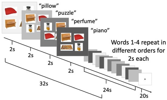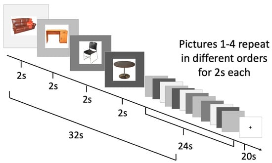 Blocked cyclic picture naming is an experimental paradigm that is well established to recruit executive functions during picture naming based on prior fMRI and EEG studies [,]. In blocked cyclic naming, four pictures are initially presented. Those four pictures are then repeated four times in four different orders. In total, each naming block consists of 16 naming trials of four pictures. Each picture was displayed for a set period of two seconds, so the total block lasted 32 s. Each 32 s naming block was followed by a 20 s baseline block displaying only a fixation cross (see Figure 1 for an illustration). There were a total of eight naming blocks, of which four presented pictures of semantically related words and four presented pictures of phonologically related words. Following previous studies using blocked cyclic naming paradigms, semantically related words were defined as those that belong to the same category (e.g., furniture, clothing, vegetables), and phonologically related words were defined as those that start with the same initial consonant (e.g., puzzle, pillow, perfume, piano). No categories, initial consonants or words were repeated from block to block.