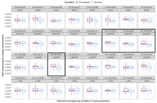 Mean HbO concentration changes over time during the production of phonologically and semantically related words. The phonological condition is shown in the leftmost boxes in maroon, and the semantic condition is shown in the rightmost boxes in light blue. Points show each participant’s individual mean HbO concentration change, with boxes showing the mean and standard deviation. P–values resulting from pairwise t–tests corrected for multiple comparisons are shown along with the channel number and brain region, and channels with significantly greater HbO concentration changes over baseline are outlined with a black box.