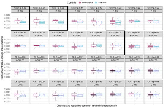 Mean HbO concentration changes over time during the comprehension of phonologically and semantically related words. The phonological condition is shown in the leftmost boxes in maroon, and the semantic condition is shown in the rightmost boxes in light blue. Points show each participant’s individual mean HbO concentration change, with boxes showing the mean and standard deviation. P–values resulting from pairwise t–tests corrected for multiple comparisons are shown along with the channel number and brain region, and channels with significantly greater HbO concentration changes over baseline are outlined with a black box.