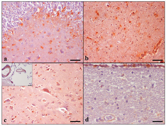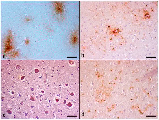 In the feline brain, a correlation between amyloid beta deposition and increasing age has been widely documented [59]. In the current study, both intracellular and extracellular Aβ deposits were observed. The latter were detected from the age of 7 years old. Previous studies of feline Aβ pathology have reported deposits in cats over 7.5 years old [6,60,61,62], but in a recent study, the youngest cat was 4 years old [8]. However, additional data regarding the animal’s detailed history were not mentioned.