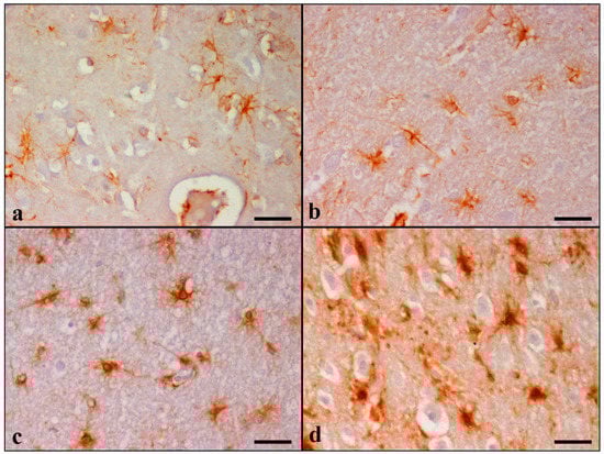 Immunohistochemistry was performed using a Super Sensitive Polymer-HRP IHC Detection System (BioGenex, Fremont, CA, USA). The primary antibodies used are listed in Table 2. Deparaffinized sections after EDTA microwave incubation (EnvisionFLEX, Target retrieval solution, high pH, Dako, Glostrup, Denmark) for 20–30 min at 500 watts (95–100 °C) for epitope retrieval were then treated with 3.6% hydrogen peroxide (H2O2)—methanol at room temperature for 30 min. They were subsequently incubated in 10% NGS at 37 °C for 30 min to avoid nonspecific reactions. The sections were then incubated at 4 °C overnight with one of the primary antibodies. After washing three times in PBS, sections were incubated with poly-HRP reagent (from Super Sensitive Polymer-HRP IHC Detection system) at room temperature for 40 min. Then, sections were washed with PBS and visualized with 0.05% 3-3′diaminobenzidine and 0.03% H2O2 in DW. Counterstaining was performed with Delafield hematoxylin. As positive controls for antibodies against MT-I/II, tissue sections from feline kidney samples were used, and for GFAP and Aβ42, sections from previously tested aged feline brain samples were used [6]. As negative controls, sections where the primary antibody was replaced by PBS were used.