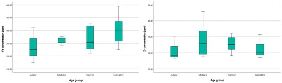The results were not statistically significant (p > 0.1) for both iron and zinc. A mild age-dependent numerical increase in iron and mildly elevated zinc concentration in the Mature and Senior groups were noticed.