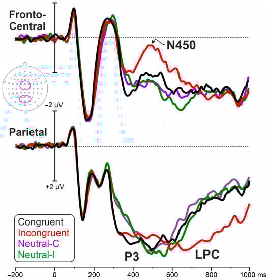 Event-related potentials (ERPs), leveraging the high temporal resolution, represent a suitable technique to address the debate between early and late processing stages of cognitive interference. However, most Stroop studies using ERP not only are outdated but also present conflicting results. In brief, some studies supported the idea of cognitive interference acting at early stages of perceptual and attentional processing between 250 and 600 ms post-stimulus [14,15,16,17]. Other studies supported late selection explanations just before response emission [9,18,19,20,21]. Collectively, these studies describe the modulation of Stroop effects on three main ERP components: the P3, an ERP emerging between 300 and 700 ms post-stimulus, which is typically highest on centroparietal areas and whose amplitude mainly represents the amount of attention used during stimuli processing [22]; the N450, a frontocentral-distributed component with onset between 400 and 600 ms post-stimulus and reflecting conflict detection [23]; and the late positive complex (LPC), maximal at 600 ms post-stimulus, indexing contextual integration and post-decision closure [24].