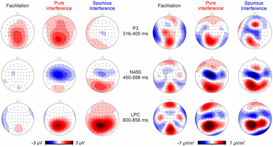 Figure 1 shows the post-stimulus ERP obtained in each of the four conditions. Figure 2 shows the differential waves in the two considered ROIs showing the P3, N450, and LPC effects. Figure 3 shows the relative voltage and CSD distribution in the three studied intervals.
