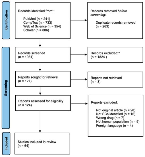 Preferred Reporting Items for Systematic Reviews and Meta-Analyses (PRISMA) flow diagram. * Total: 2214 records. ** Subject excluded (n = 996), not human (n = 393), other drugs (n = 278), in vitro (n = 157).