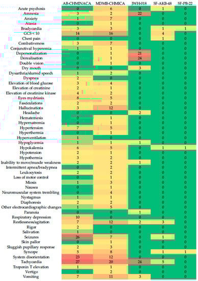 In our review, the most frequent toxic effects mentioned in CS were tachycardia, followed by seizures (Figure 2). In total, 26.1% of CR detailed fatal intoxications from using SCs, particularly AB-CHMINACA, in which 50% of studies detailed the substance’s lethal effects. The reported studies presented severe degrees of intoxication and neuropsychiatric symptoms. In our study, the SCs AB-CHMINACA and ADB-FUBINACA had the highest frequency of symptoms and accounted for 41% of all reported fatalities.