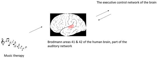 It has been established that neurologic music therapy has a tool for auditory entrainment of motor function and can improve clinical outcomes in PD patients. However, the exact mechanisms are not largely known yet. Tomaino C. reviewed the related paper to bridge science and music-based interventions and suggested the cerebellum’s role, along with other subcortical systems, in pre-learned motor schema modulation during neurologic music therapy []. Brancatisano O. et al. [] proposed the Therapeutic Music Capacities Model that links individual properties of music to therapeutic mechanisms and its benefit on cognitive, psychosocial, behavioral, and motor function. Furthermore, Buard I. et al. [] utilize neuroimaging and neurophysiological tools to explore the potential mechanisms in music therapy for motor impairments. They found that 5 weeks of NMT had beneficial effects on fine-motor function in PD. Importantly, during a cued-finger-tapping test, MATLAB spectral analysis showed an increase in evoked power in the beta range in the primary motor and auditory cortices task. This result suggests that an activity coupling in those two areas was related to the simultaneous activation. The study results suggested that musical interventions may influence cortical activity. Specifically, after music therapy, the auditory and motor cortices would be more strongly functionally connected, which can be observed by neuroimaging and neurophysiological tools. Additionally, Braunlich K. et al. [] investigated the neural systems underlying the music therapeutic effect by scanning PD patients and age-matched healthy controls using functional magnetic resonance imaging (fMRI). All subjects performed rhythmic motor behavior with and without simultaneous auditory rhythmic cues. Using spatial independent component analysis (ICA) and regression, the authors identified task-related functional connectivity networks. They found greater inter-network connectivity between the auditory and executive control networks in PD subjects (Figure 1). This finding may be responsible for cortico-cerebellar network activity modulation. In addition, a secondary EEG analysis of a randomized clinical trial in PD patients suggested that the cerebellum mediates the reshaping of sensorimotor rhythms and front-centroparietal connectivity concerning specific gait-cycle phases [].