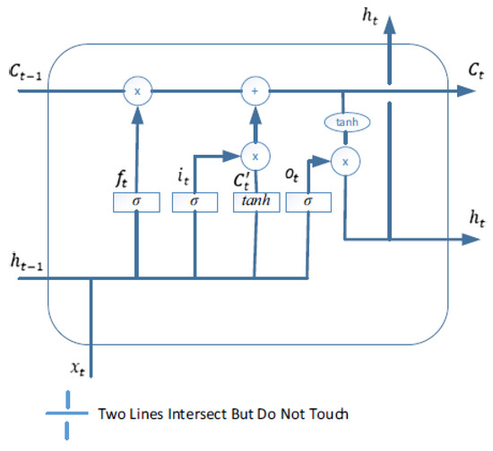 In order to determine the hidden state of an LSTM, a computation involving Equation (2) is performed on the output gate . This computation is then multiplied by the cell state through the use of the tanh function in Equation (6). The weight matrix for the input is denoted by , while the weight matrix for the hidden state is represented by . Additionally, a bias term is included in the computation, which is indicated by . Finally, the sigmoid function is also utilized Sigm (x) = . The most important part of the LSTM structure is and . These functions retain the data for a long period. As a result, this mechanism supports the long-term dependencies. The mathematical equations of the LSTM memory block are summarized as follows: