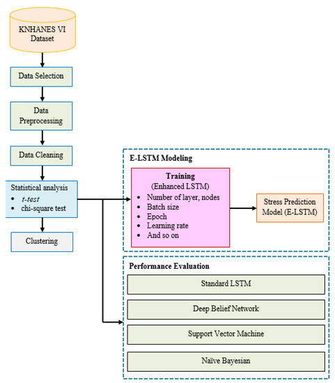 In this study, we demonstrated the proposed framework which included enhanced LSTM with the combination of feature attention mechanism. The research design of this study is demonstrated in Figure 3. From the KNHANES VI dataset, this study considered various stress-related features from physical activity and lifestyle data, including systolic blood pressure, sleep time, body mass index, smoking, and drinking. The variables that were considered important for stress evaluation were extracted using statistical analysis of the selected data.