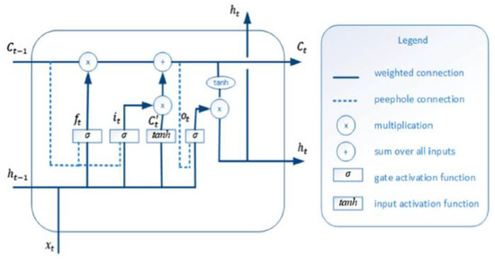 LSTM networks are an advanced variant of traditional RNN, which was first developed by German authors Sepp Hochraiter et al., in 1997 [51], which are also followed by the existing architecture of RNNs with minor modifications [52]. We have already described the conventional LSTM network with a gating mechanism, which is depicted in Figure 2. However, here we introduced the enhanced LSTM architecture with modified equations that support the development of learning capabilities. The computational process of enhanced LSTM is not the same as the standard ones. In our enhancement, we used the “peephole connections mechanism” which is one of the most well-known variations of the LSTM architecture. Figure 4 presents the enhanced architecture of LSTM with peepholes.
