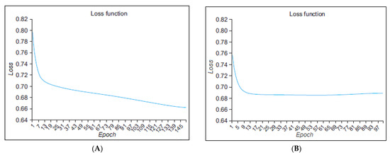 Figure 8 presents the loss function graph of the proposed approach in the term of configuration; (A) configuration 1 and (B) configuration 2, for stress classification dataset. On the graph, the epoch is displayed on the x-axis while the loss is depicted on the y-axis. The loss function has been captured based on 100 and 150 epochs (the left side of Figure 8A contains 150 epochs and the right-side of Figure 8B contains 100 epochs). However, the proposed approach maintains their loss rate after 140 epochs in configuration 1, while in the configuration 2, the model maintains their loss rate between 13 and 37 iterations. The loss function is a mathematical expression that computes the difference between the real and predicted outputs.